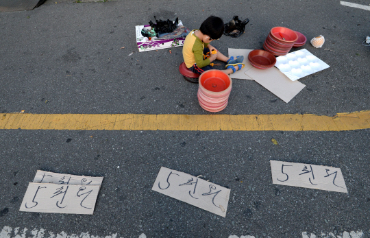 시장 언저리에서 과일을 파는 엄마, 아빠가 준비한 과일을 일찌감치 모두 다 팔았기 때문입니다.
