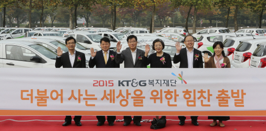 곽영균(왼쪽 세 번째) KT&G 복지재단 이사장이 21일 경기 과천시 서울대공원에서 이호경(〃네 번째) 한국노인종합복지관협회 회장 등에게 장애인복지관, 노인종합복지관, 지역 아동센터 등 사회복지기관에서 쓰일 100대의 경차를 전달하고 있다.