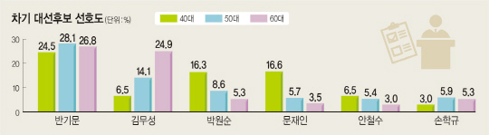 29일 문화일보 정치의식 조사에 따르면 ‘차기 대선 후보로 누가 가장 적합하다고 생각하느냐’는 질문에 40대의 24.5%, 50대의 28.1%, 60대의 26.8%가 반 총장을 ‘1순위’로 꼽았다. 반 총장 외에 40·50·60대 모두에서 상위권인 5순위 내에 오른 ‘잠룡’은 김 대표와 박원순 서울시장이었다. 문 대표는 40대에서 반 총장 다음으로 16.6%를 얻어 2위에 올랐지만 50대에서는 5위(5.7%)를, 60대에서는 6위(3.5%)를 기록했다.