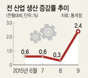 올 9월 전(全)산업 생산 증가율은 전월대비 2.4%를 기록, 지난 2011년 3월(4.0%) 이후 최고치를 기록했다. 광공업 생산도 전월대비 1.9% 증가했고, 서비스업 생산도 1.2% 늘었다. 제조업 평균 가동률도 75.1%로 호조세를 보였다.