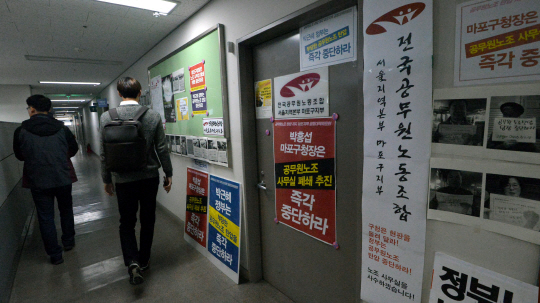 30일 오전 서울 마포구 월드컵로 마포구청에서 법외노조인 전공노(전국공무원노조) 마포구지부가 구청의 사무실 폐쇄에 항의, 임시 현판을 붙여 놓고 농성을 벌이고 있다. 행정자치부에 따르면 이날 오후 안산시는 현재까지 자진 철수를 하지 않고 있는 전공노 안산시지부 사무실 강제폐쇄 조치를 취할 계획인데, 만일 폐쇄가 실현되면 전국 공공기관 내 전공노 사무실은 모두 사라지게 된다.(문화일보 10월 29일자 19면 참조)