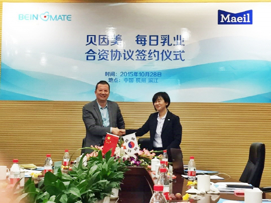 김선희(오른쪽) 매일유업 사장이 중국 영유아 특수 분유 시장 진출을 위해 29일 중국 저장성 항저우의 중국 내 1위 유아식 업체인 비잉메이트 본사에서 황타오 사장과 조인트벤처 설립 계약을 맺었다. 공동 상표인 ‘줘뤄이캉(佐瑞康)’은 12월에 출시된다.
