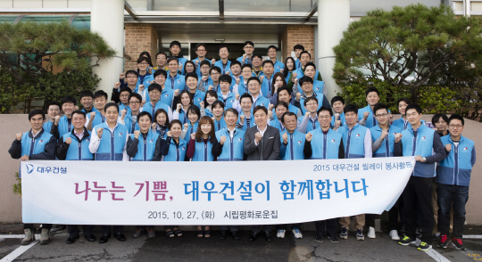 대우건설 임직원들이 서울 은평구에 있는 중증장애인 거주시설 ‘시립평화로운집’에서 지난 27일 노후 시설 리모델링과 시설 환경정화 봉사활동을 한 후 기념촬영을 하고 있다. 이날 리모델링 비용은 임직원이 매달 급여 우수리 돈으로 모으고 있는 ‘임직원 동전 모아 사랑실천하기 기금’을 활용했다.