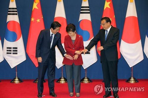 박근혜 대통령과 아베 신조(安倍晋三) 일본 총리, 리커창(李克强) 중국 총리는 1일 청와대에서 한일중 3국 정상회의를 갖고 ‘동북아 평화협력을 위한 공동선언’을 채택했다.