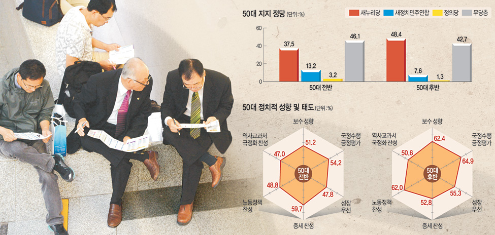 ◇ 캐스팅보트 쥔 50대 = 이병일 엠브레인 상무는 2일 “이번 정치의식 조사 결과, 50대는 나이가 들수록 진보에서 보수 성향으로 옮아가는 ‘연령효과’와 과거의 세대 경험에 따른 특징적인 성향을 보이는 ‘세대효과’가 뒤섞여 나타나는 특징을 보이고 있다”고 분석했다. 이 상무는 또 “50대는 정치의식과 이념 성향의 보수화가 나타나기 시작하는 집단으로 내년 총선의 캐스팅보트가 될 것”이라고 밝혔다.
