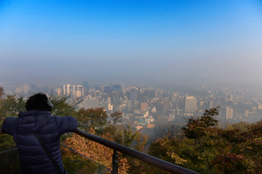서울시와 수도권 미세먼지 농도가 ‘나쁨’ 수준까지 오른다고 예보된 4일 오전 서울 중구 남산 둘레길 코스 전망대에서 내려다본 서울 시내가 뿌연 미세 먼지로 뒤덮여 있다.
