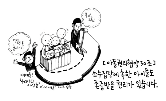 다문화 또는 이주노동자, 새터민, 난민 가정 출신 아동 및 장애 아동과 미혼모 등을 실질적으로 보호할 수 있는 정책과 전략을 개발 및 실행할 것을 유엔아동권리위원회는 권고하고 있다. 소수집단에 속하는 아동들도 자신들의 고유한 문화와 종교를 가지고, 그들의 언어를 사용할 권리를 거부당하지 않아야 한다.
