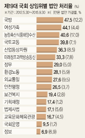 19대 국회에서 정쟁이 잦았던 상임위원회일수록 입법 성적이 좋지 않았던 것으로 나타났다. 전체 16개 상임위원회 가운데 대선 개입 의혹 사건 등으로 몸살을 앓았던 정보위원회의 법안 처리율(6.9%)이 가장 낮았다. 겸임 상임위(정보위, 운영위원회, 여성가족위원회)를 제외한 13개 상임위에서는 역사교과서 국정화로 갈등의 중심에 서 있는 교육문화체육관광위원회가 16.7%로 가장 낮았다.