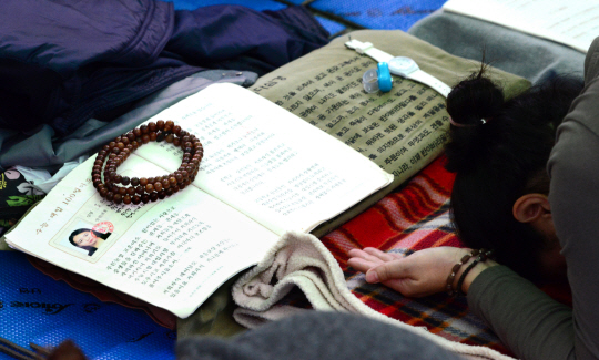 2016학년도 대학수학능력시험을 나흘 앞둔 8일 서울 강북구 우이동 도선사 석불전에서 한 수험생 학부모가 자녀의 합격을 기원하며 엎드려 절하고 있다.