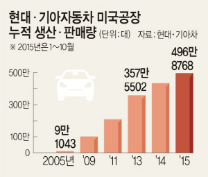 현대·기아차는 중국에 이어 세계 2위 시장이자 글로벌 자동차산업 중심지인 미국에 현지 생산공장을 설립, 가동한 이후 급성장했다. 공장 가동 이전인 2004년 68만8671대에 그쳤던 미국 내 판매량은 지난해 130만5952대로 2배 가까이 증가했고, 올해도 10월까지 116만4217대를 판매해 성장세를 이어가고 있다.