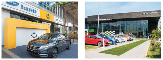 르노삼성에 앞서 현대차 역시 지난해부터 국내는 물론 전 세계 6000여 개 전시장을 대상으로 글로벌 신규 딜러 표준인 ‘글로벌 딜러십 스페이스 아이덴티티(GDSI·오른쪽)’를 적용하는 작업을 진행 중이다.