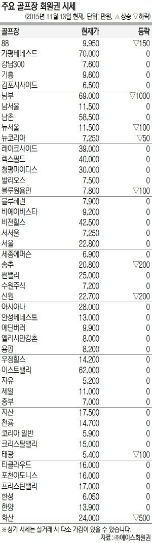 회원권시장의 약보합세가 요지부동이다. 시즌 마감 이후 증가한 매물과 매매 시기를 미룬 매수자들의 시각이 엇갈리며 추세가 장기화하는 양상이다. 초고가권에서는 이스트밸리의 강보합을 제외하고 매물이 증가한 남부회원권이 하락세이고, 가평베네스트도 거래 없이 호가가 하락 중이다. 고가권에선 신원과 지산 회원권이 약보합이나 송추와 화산은 거래 주문이 유입되면서 보합으로 ‘선방’했다. 중가권에선 강남300, 남서울, 태광, 한성 등 근교 종목들 다수가 하락했으나 골드주주와 신안회원권은 매물 기근으로 강세다.