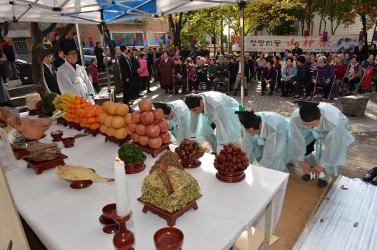 12일 서울 동대문구 청량리동 마을마당에서 주민들이 참석한 가운데 천장산 산신제가 봉행되고 있다. 이 제사는 주민의 안녕을 기원하고 수확의 계절에 하늘과 조상에 대한 감사의 마음을 올리기 위해 동대문구 회기동과 성북구 석관동에 결쳐 있는 천장산에서 봉행해 오던 것이다.