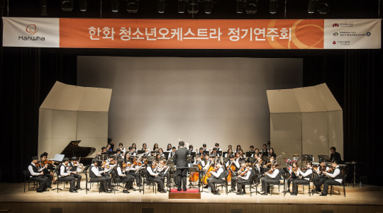 한화그룹이 한국메세나협회와 함께 진행하는 ‘한화 청소년오케스트라’가 14일 충남 천안시 예술의전당 소극장에서 정기 연주회(사진)를 개최했다. 2014년부터 시작한 ‘한화청소년오케스트라’는 청주와 천안 지역의 청소년들이 정통 클래식 악기를 접할 수 있도록 하는 음악교육 프로그램의 하나로 결성됐다. 2015년 현재 60여 명의 청소년들이 단원으로 참여하고 있다.