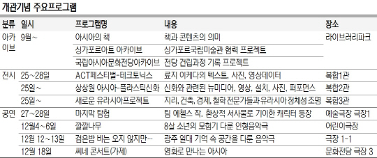그동안 아시아 각국과 문화협력을 통해 개관을 준비했던 문화전당은 아시아 권역별 문화장관회의를 개최했을 뿐만 아니라, ‘아시아 전통오케스트라’ 창단, ‘아시아 무용단’ 창단, ‘아시아 스토리텔링 사업’ 등을 추진해왔다. 문화전당 개관에 맞춰 ‘제2차 한국-중앙아시아 문화장관 회의(25일)’, ‘제4회 아시아 창작공간 네트워크(24일∼12월 24일)’ 등의 행사를 진행한다.