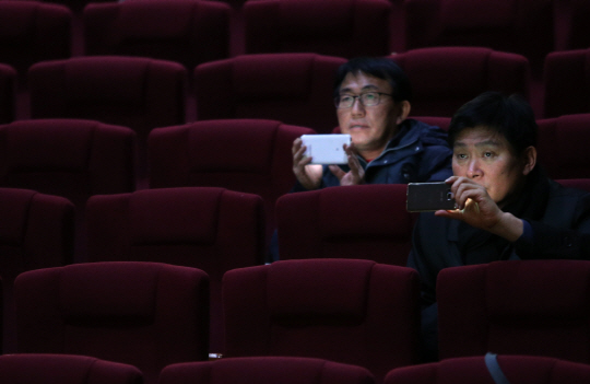 26일 서울 광진구 건국대 새천년관에서 서울시교육청 교육연구정보원이 주최한 ‘고교 진학담당 교사 대상 대입 설명회’ 도중에 참석자들이 강의 자료를 휴대전화 카메라로 촬영하고 있다.