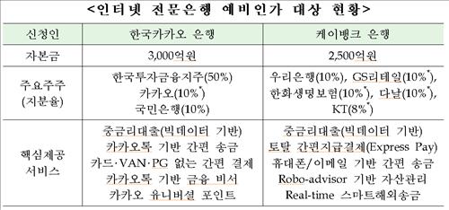 금융위는 이날 예비인가와 함께 동일인(비금융주력자)이 주식보유한도(4%)를 초과한 카카오은행의 카카오와 케이뱅크의 KT, GS리테일, 다날, 한화생명[088350], KG이니시스[035600] 등의 보유한도 초과 신청을 승인했다.
