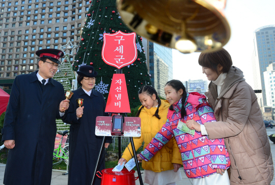 구세군 자선냄비 모금이 시작된 1일 오전 서울 중구 세종대로 서울광장에 마련된 자선냄비에 시민들이 성금을 넣고 있다.