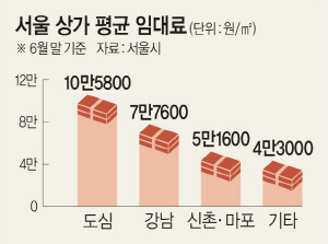 서울시는 2일 강남과 도심, 신촌·마포, 기타 상권의 3층 이상 건물 176채에 자리 잡은 매장 1000곳의 권리금을 조사한 결과, 강남이 가장 비쌌다고 밝혔다.