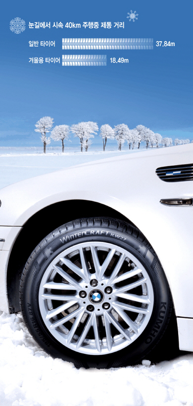 실제로 한국타이어가 테스트한 결과 눈길에서 시속 40㎞로 달릴 경우 사계절 타이어는 제동거리가 37.84m인 반면 겨울용 타이어는 18.49m에 그쳐 제동력이 2배나 높은 것으로 조사됐다.