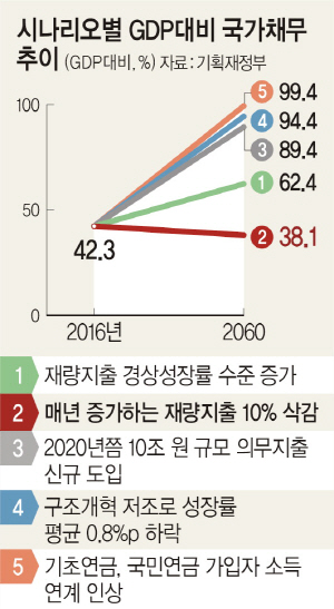 정부는 재량 지출이 경제 규모가 성장하는 수준(경상성장률)만큼 증가할 경우(시나리오 1) 국내총생산(GDP) 대비 국가채무 비율이 2016년 42.3%에서 2060년 62.4%까지 증가할 것으로 내다봤다. 매년 증가하는 재량 지출 중에서 10%를 삭감할 경우(시나리오 2)에는 2060년 GDP 대비 국가채무 비율이 38.1%로 안정화될 수 있다는 전망도 ‘사족(蛇足)’처럼 붙여놨지만, 현실성이 떨어진다는 사실을 정부도 잘 알고 있다.
