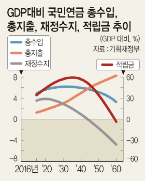 4일 기획재정부가 발표한 2060년 장기재정전망을 보면 적자가 발생하더라도 국고 보전이 없는 사회보장성기금(국민연금, 사학연금, 산재보험, 고용보험) 가운데 국민연금은 2019년 흑자 최대치를 기록한 이후 2044년 적자 수지로 전환되는 것으로 나타났다. 적립금은 2035년 최대치에 이르지만 2060년에 이르러선 고갈될 전망이다.