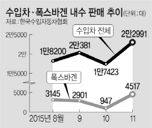 폭스바겐의 판매량 급증과 개별소비세 인하 효과 등에 힘입어 11월 전체 수입차 판매량도 지난 10월 1만7423대보다 32.0% 증가한 2만2991대를 기록했다. 이는 지난 6월 기록한 2만4275대에 이어 역대 두 번째로 많은 판매량이다.