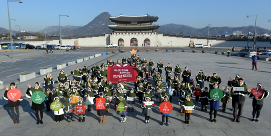 국제구호단체인 굿네이버스가 7일 오전 서울 광화문광장에서 국내 빈곤가정 아동을 돕는 ‘2015 희망트리 캠페인’ 발대식을 열고, 나무 모양을 형상화한 퍼포먼스를 펼치고 있다.