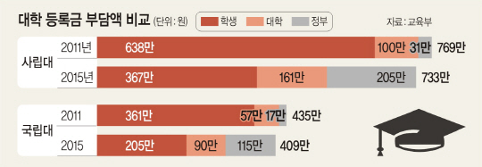 7일 교육부와 한국장학재단에 따르면 2011년 사립대 학생 1인당 평균 등록금은 769만 원으로 이 중 학생이 638만 원을 부담하고 대학이 100만 원, 정부가 31만 원을 내는 구조였다. 대학과 정부가 주는 장학금이 131만 원 정도였던 것이다. 하지만 2015년 사립대 학생 1인당 평균 등록금은 733만 원으로 4년 만에 36만 원이 낮아진 데다 정부가 205만 원, 대학이 161만 원의 장학금을 지원해 학생 부담은 367만 원으로 크게 떨어졌다. 국립대도 2011년 학생 1인당 평균 등록금이 435만 원이었는데 이 중 대학과 정부가 주는 장학금은 72만 원 수준이었다. 2015년에는 국립대 학생 1인당 평균 등록금이 409만 원으로 낮아졌고, 여기에 정부가 115만 원·대학이 90만 원의 장학금을 지원해 학생 부담이 2011년보다 156만 원이나 떨어진 205만 원이다.