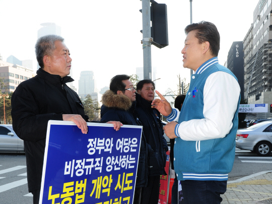 신용한(오른쪽) 대통령직속 청년위원회 위원장이 7일 국회 앞에서 노동개혁법 통과 저지를 위해 1인 시위를 하고 있는 김동만(왼쪽) 한국노총 위원장을 만나 이야기를 나누고 있다.