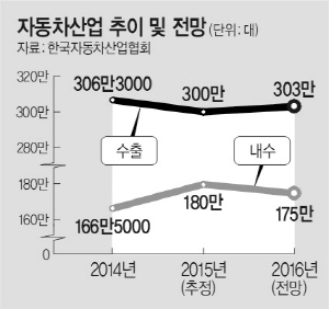 9일 한국자동차산업협회(KAMA)가 발표한 ‘2016년 자동차산업 전망’에 따르면 내년 자동차 내수판매는 개별소비세 인하 효과가 사라지고 가계부채 부담 증가 등으로 올해보다 2.8% 줄어든 175만 대 수준에 그칠 것으로 예상됐다.