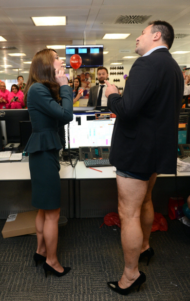 영국 윌리엄 왕세손의 아내 케임브리지 공작부인(왼쪽)이 9일 영국 런던에서 열린 금융중개회사 ICAP의 연말 자선 파티에 참석, 팬티에 하이힐을 신은 한 남성 트레이더와 이야기를 나누고 있다.