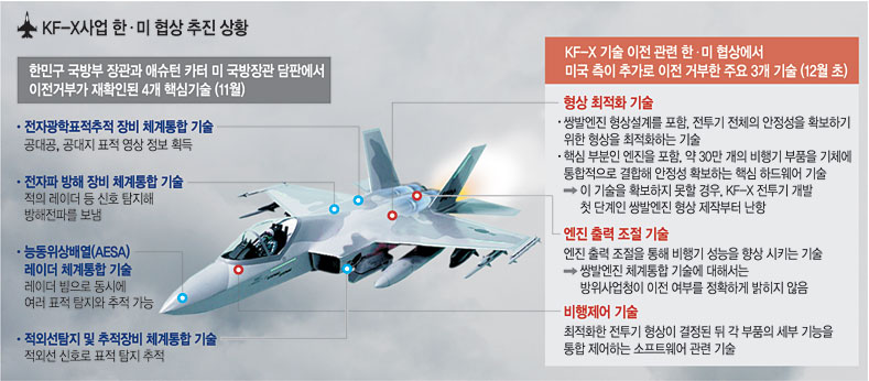 한국형전투기(KF-X) 개발사업과 관련, 미국 정부가 방위사업청이 올해 초 요청한 21개 기술이전에 필요한 약 300명의 기술인력 지원과 관련해 주요 3개 기술 이전 관련 인력 100명의 파견 불가 입장을 지난달 협상팀에 통보한 것으로 10일 전해졌다. 3개 기술은 △전투기 형상(形象) 최적화 기술 △비행제어기술 △엔진 출력조절 기술 등이다.