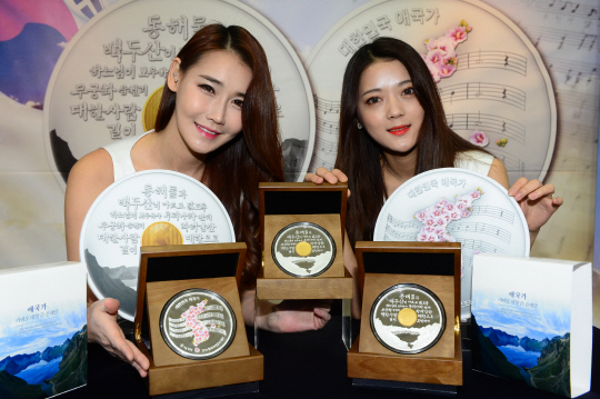 15일 오전 서울 마포구 창전동 한국조폐공사 서울사업본부에서 모델들이 광복 70주년 애국가 기념 메달을 선보이고 있다.