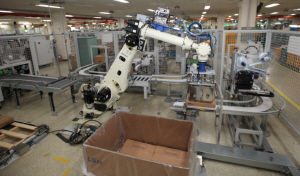 15일 LS산전에 따르면 청주 1사업장은 무인운반차가 자동으로 원료와 완제품을 실어나르고, 무인 운반차가 옮긴 완제품을 포장하는 라인(사진)도 100% 자동화돼 있다.