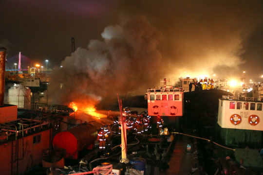 14일 오후 부산 동구 좌천동 부산항 5부두에 정박 중인 720t급 석유제품운반선 폐유 저장탱크에서 유증기 폭발로 추정되는 불이 나 소방대원들이 화재를 진압하고 있다.