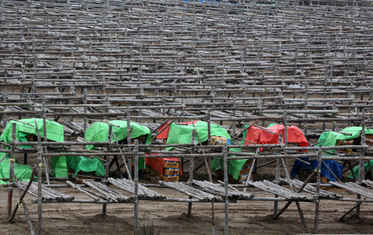 포근한 날씨가 이어지면서 14일 강원 평창군 대관령 일대의 황태덕장이 텅 비어 있다. 비를 맞지 않게 쌓아놓은 채 강추위가 시작되기만 기다리는 명태 뭉치들이 비닐 포장 아래 보인다.
