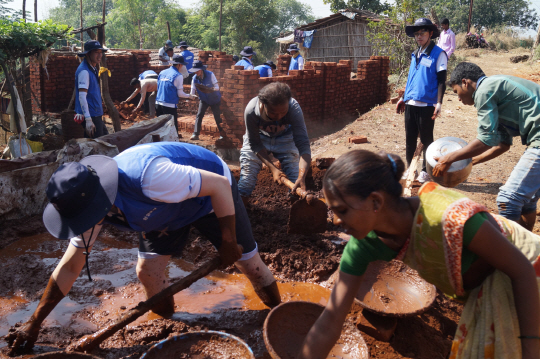 삼성물산은 인도 뭄바이에서 3시간 떨어진 차르가온에서 임직원들이 현지인들과 함께 ‘삼성물산 2호 마을’(주택 50가구 신축·81가구 화장실 개축·학교 2개 리모델링) 건립 사업을 벌이고 있다고 16일 밝혔다.