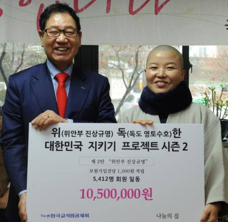 이규택(왼쪽) 한국교직원공제회 이사장은 21일 일본군 위안부 피해 할머니들의 쉼터 경기도 퇴촌 나눔의집을 방문해 부원장인 호련 스님에게 후원금 1000만 원을 전달했다.
