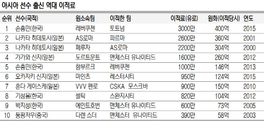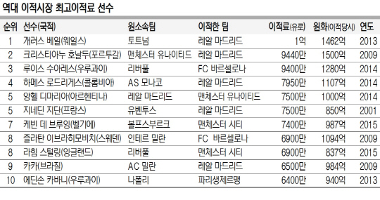 베일의 역대 최고 이적료(1억 유로), 2위 크리스티아누 호날두(30·레알 마드리드)의 이적료(9440만 유로)는 모두 여름 이적시장에서 나왔다. 역대 이적료 랭킹 1∼11위는 모두 여름 이적시장에서 배출됐다. 겨울 이적시장 역대 최고 이적료(5800만 유로)인 페르난도 토레스(31)는 전체 순위에서 12위다.