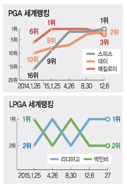 조던 스피스(23·미국), 제이슨 데이(29·호주), 로리 매킬로이(27·북아일랜드)는 2015년 남자프로골프의 ‘3강 구도’를 형성했다. 뉴질랜드 교포 리디아 고(19)와 박인비(28)는 여자프로골프의 ‘원투펀치’에 비유됐다.