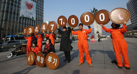 30일 서울 세종대로 광화문광장에서 환경운동연합 관계자들이 우리나라가 1988년부터 현재까지 바다에 버린 ‘육지 쓰레기’가 1억3047만7000t임을 알리는 퍼포먼스를 하고 있다. 정부는 해양투기방지 국제협약 체결에 따라 2016년부터 해양 배출을 전면 금지하고 육상 처리방식으로 전환한다.
