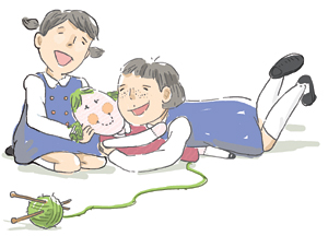 방금 완성한 뜨개 아이를 바닥에 내려놓고 아줌마와 키를 대어보았어요. 아줌마 허리만큼 왔어요. 아줌마가 뜨개 아이를 번쩍 들어 꼭 안아줬어요.