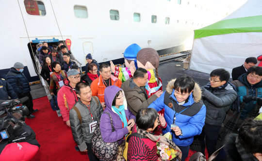 7일 오전 강원 동해항에 중국 천해크루즈사의 스카이시 골든 에라호가 입항, 승객들이 강원도와 동해시·한국관광공사 관계자들의 환영을 받으며 배에서 내리고 있다. 에라호는 동해항에 처음으로 입항하는 크루즈호다.