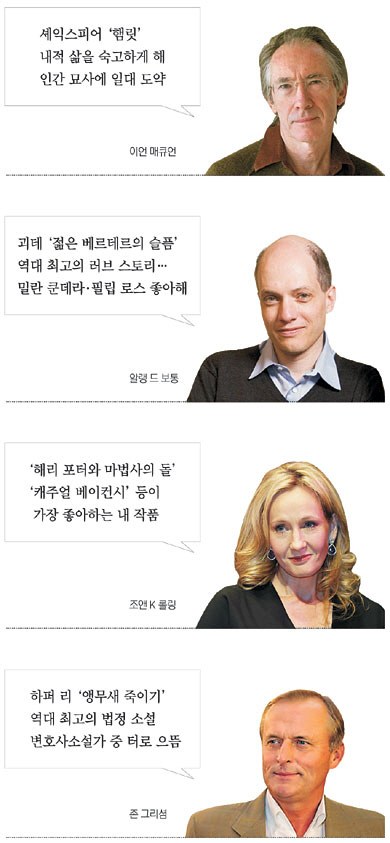 이언 매큐언, 알랭 드 보통, 조앤 K 롤링, 줌파 라히리, 존 그리셤, 이창래…. 우리가 사랑한 작가들은 어떤 작품을 읽고, 어떤 작가를 좋아할까. 또 대통령에게 추천하고 싶은 책은 무엇이고 최근 ‘꽂힌’ 책은 뭘까.
