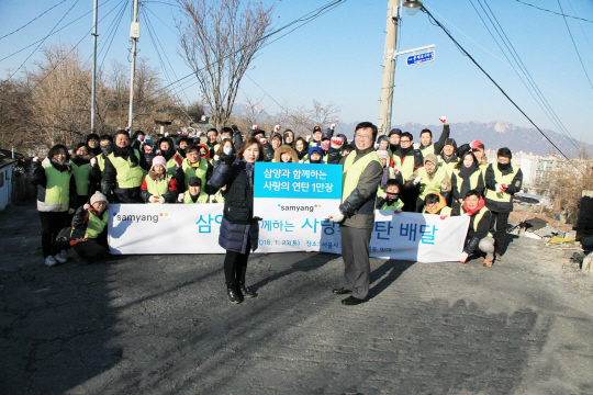 삼양그룹 신입사원 22명을 포함한 임직원과 가족들이 23일 서울 노원구 중계동의 기초생활보장 수급자와 홀몸노인 가정을 찾아 겨울나기를 위한 연탄 1만 장을 전달하기에 앞서 기념촬영을 하고 있다.