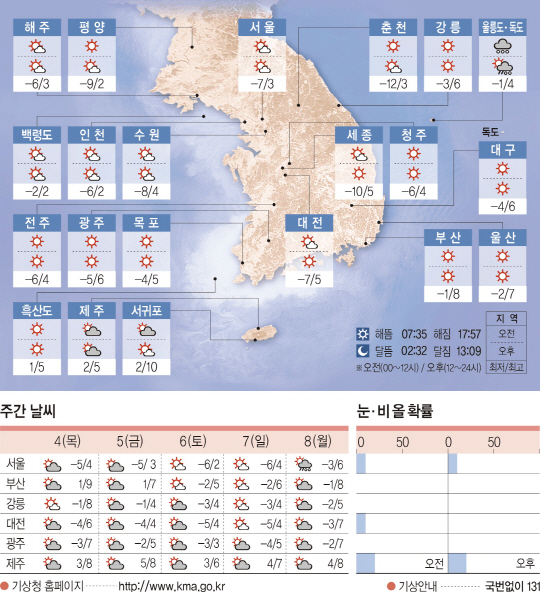 전국이 대체로 맑겠으나, 제주는 가끔 구름이 많겠다. 아침 최저기온은 영하 13도에서 영하 1도, 낮 최고기온은 영상 2도에서 8도가 되겠다.