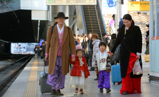본격적인 귀성 행렬이 시작된 5일 오전 서울역 플랫폼에서 한복을 곱게 차려입은 한 가족이 열차를 타기 위해 이동하고 있다.