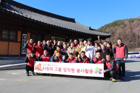 KT는 설 명절을 앞두고 4일 경남 하동군 청학동 기가 창조마을에서 주민들의 겨울나기를 돕는 봉사활동(사진)을 펼쳤다고 5일 밝혔다. 봉사활동에는 홍보실 CSV센터 영남권 CSV운영팀, 부산 고객본부 진주지사, 부산네트워크운용본부 경남 유선센터 임직원 등 약 30명이 참가했다.