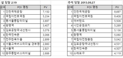 한편 T맵은 연휴 여행지를 고민하는 이들을 위해 작년 명절 인기 목적지 및 순위 정보도 공개했다.